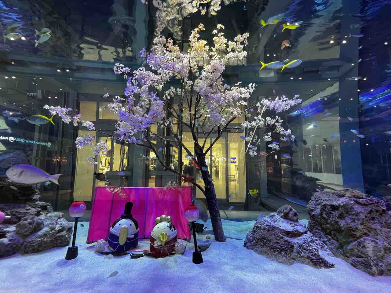 イオンモールの中にはアクエリアムまである。水槽の中にひな人形と桜。