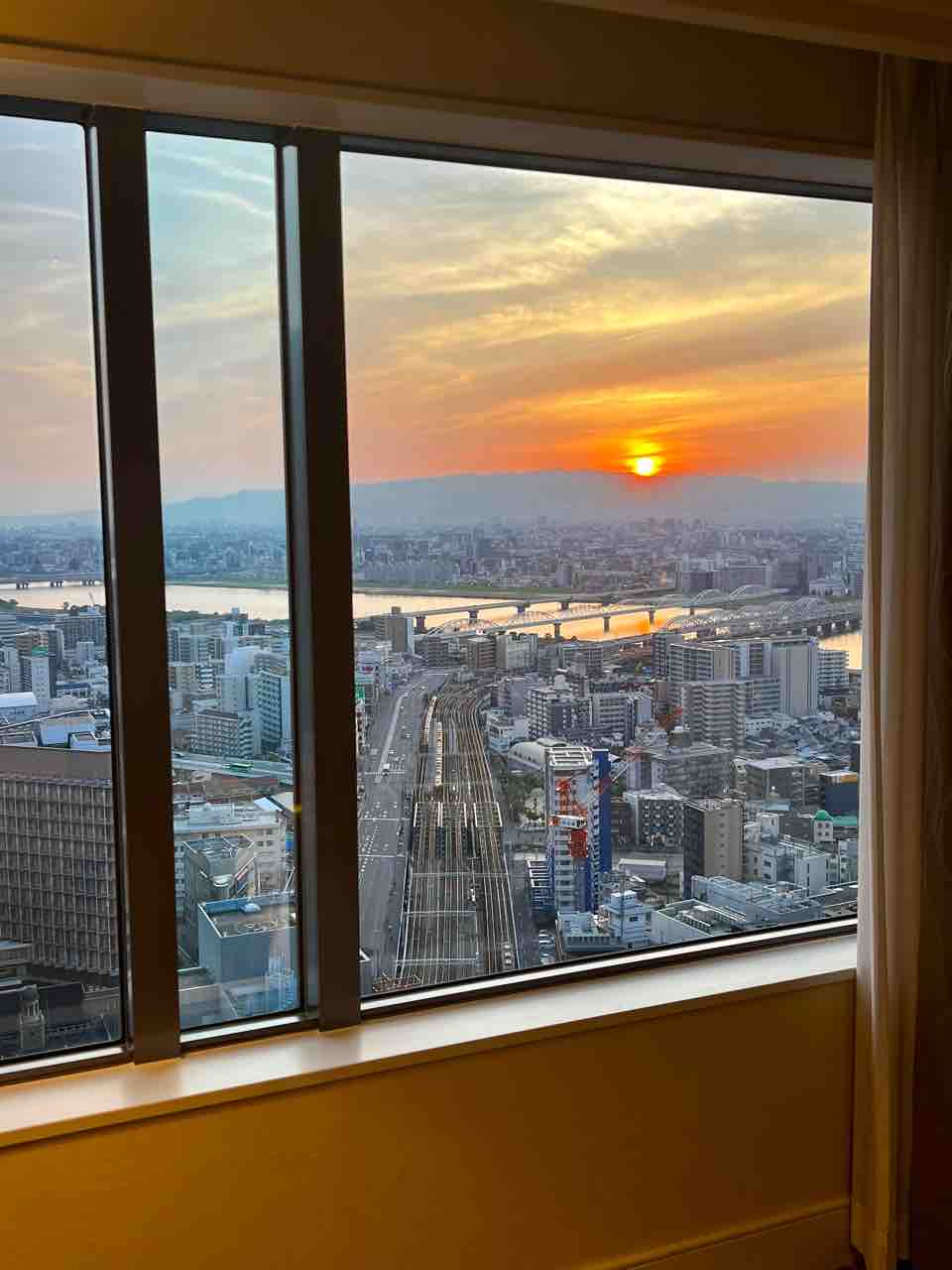 チェックインしたホテルの窓から夕日と六甲山と淀川と阪急電車。