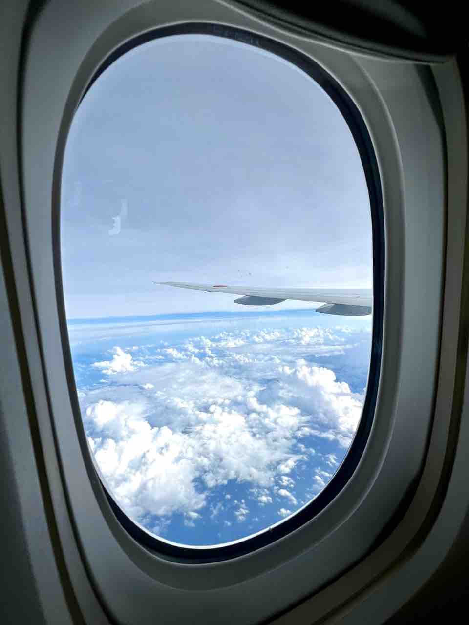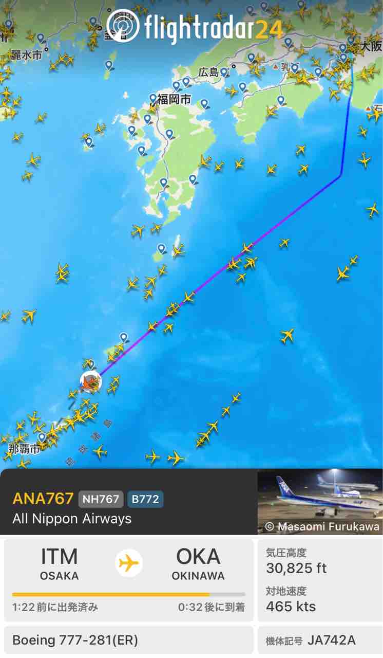 伊丹・沖縄間の便は運航していたが、案の定、空の上は大渋滞。私が予約していた便も70分遅れの出発となった。まぁ、こんな時に飛んでくれただけでも有り難い。多くの人が旅の予定をキャンセルしたのだろう。機内はガラガラ。横10席に私1人。コロナの時みたい。通路側の席を取っていたが、窓側に移動した。