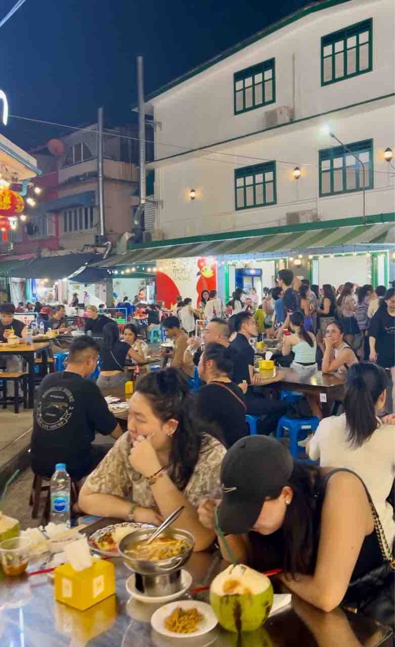 いつもバンコクに来るたびにアテンドしてくれる Cちゃんが今日もアテンドしてくれ、いまバンコクで最もホットな場所のひとつである「バンタットン通り(Banthat Thong)」へ連れて行ってくれた。「夜のグルメストリート」として有名な通りで、19時頃に着いたら人で溢れており、人気店は長蛇の列だった。