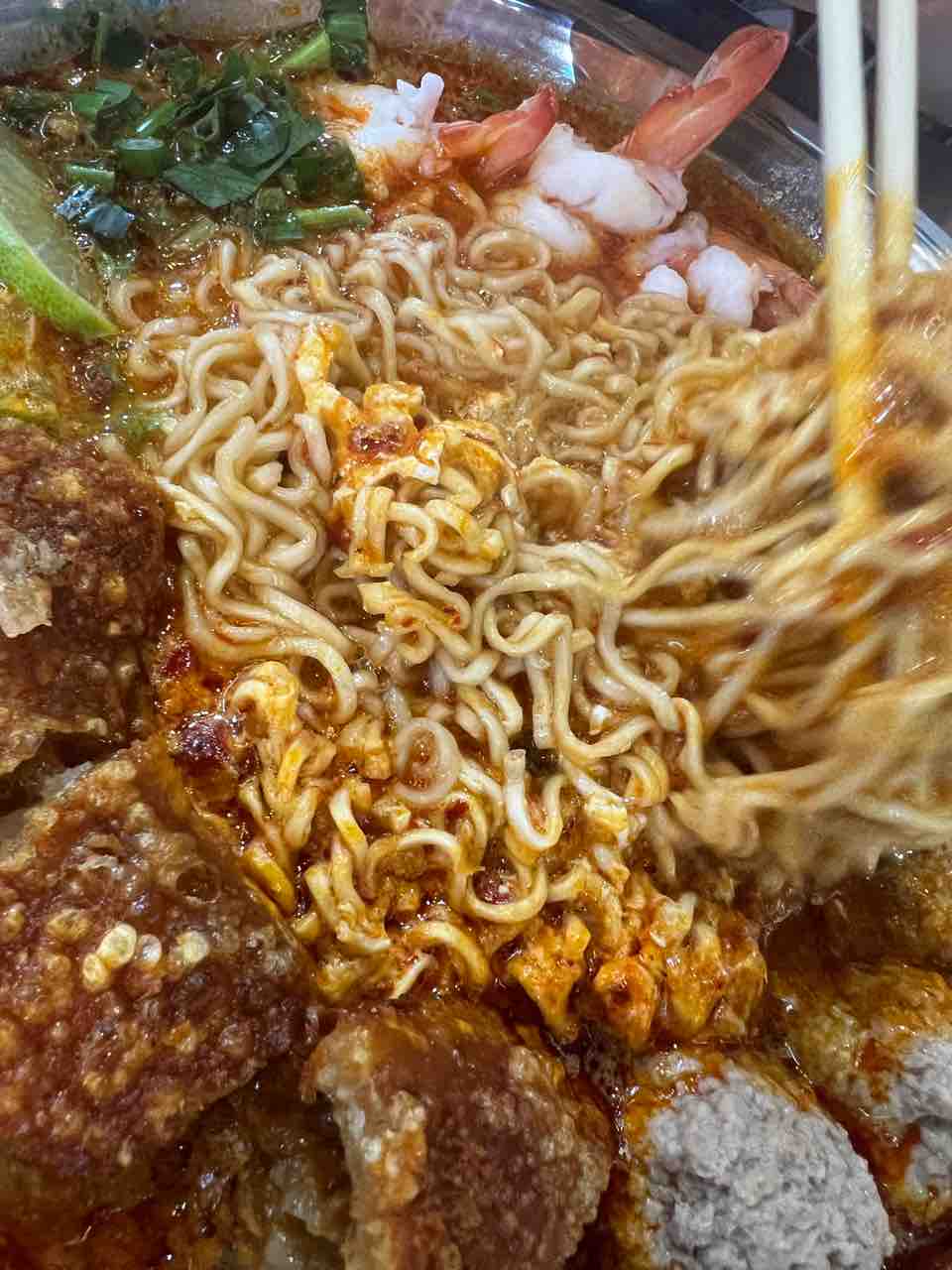 「ママートムヤム」っていうらしいんだけど、ママー麺というインスタントラーメンと、海鮮、肉、ネギ、マナオ(ライム)、玉子などをトムヤムスープに入れたトムヤムラーメン。