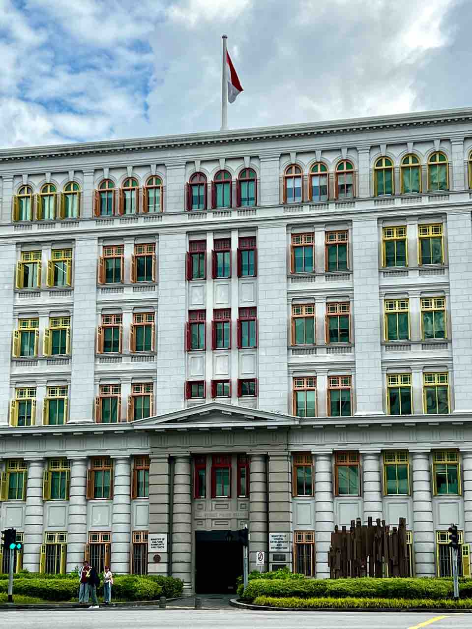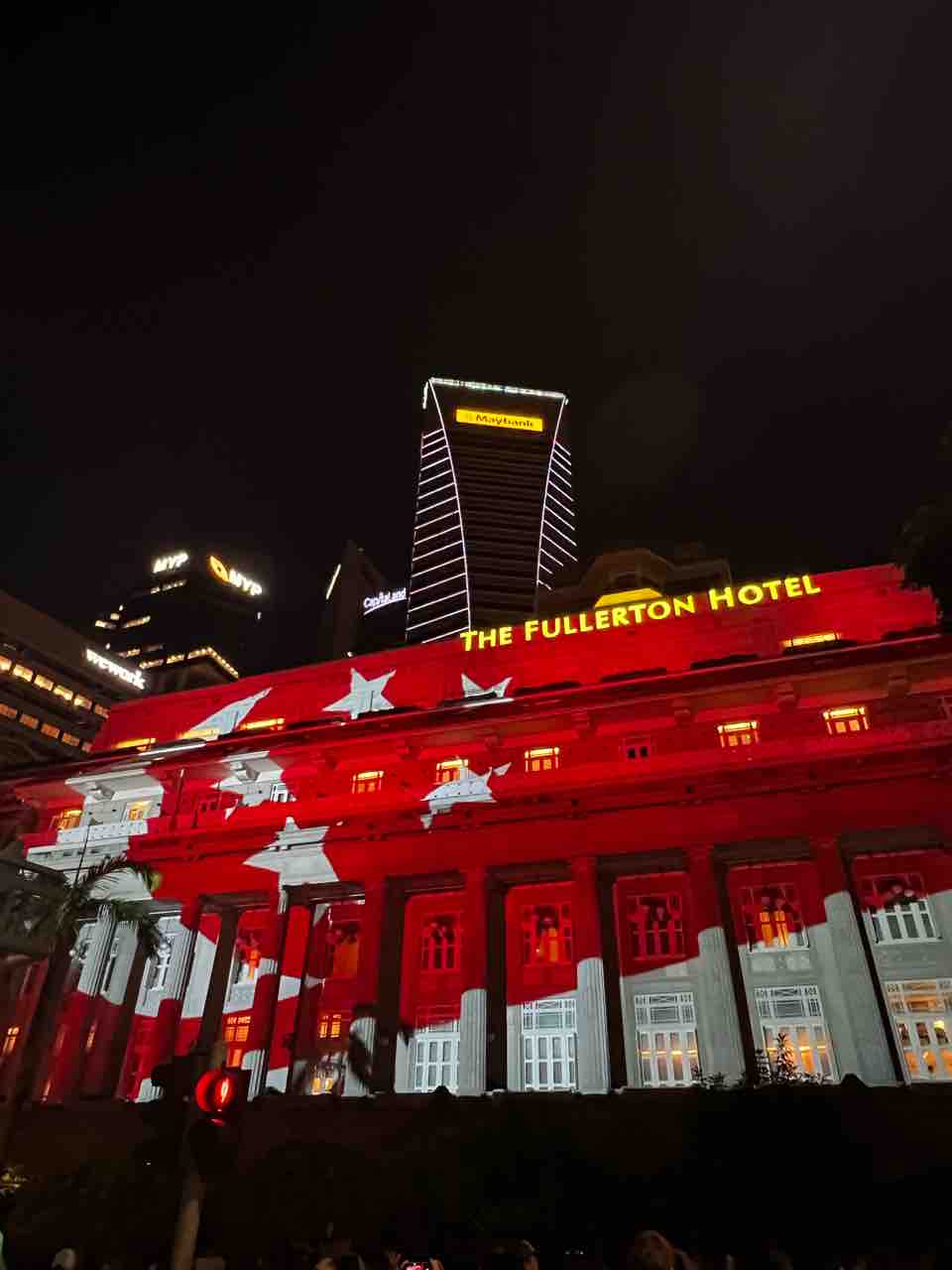 名門フラトンホテルも、シンガポール国旗のプロジェクションマッピング。かっちょえー。