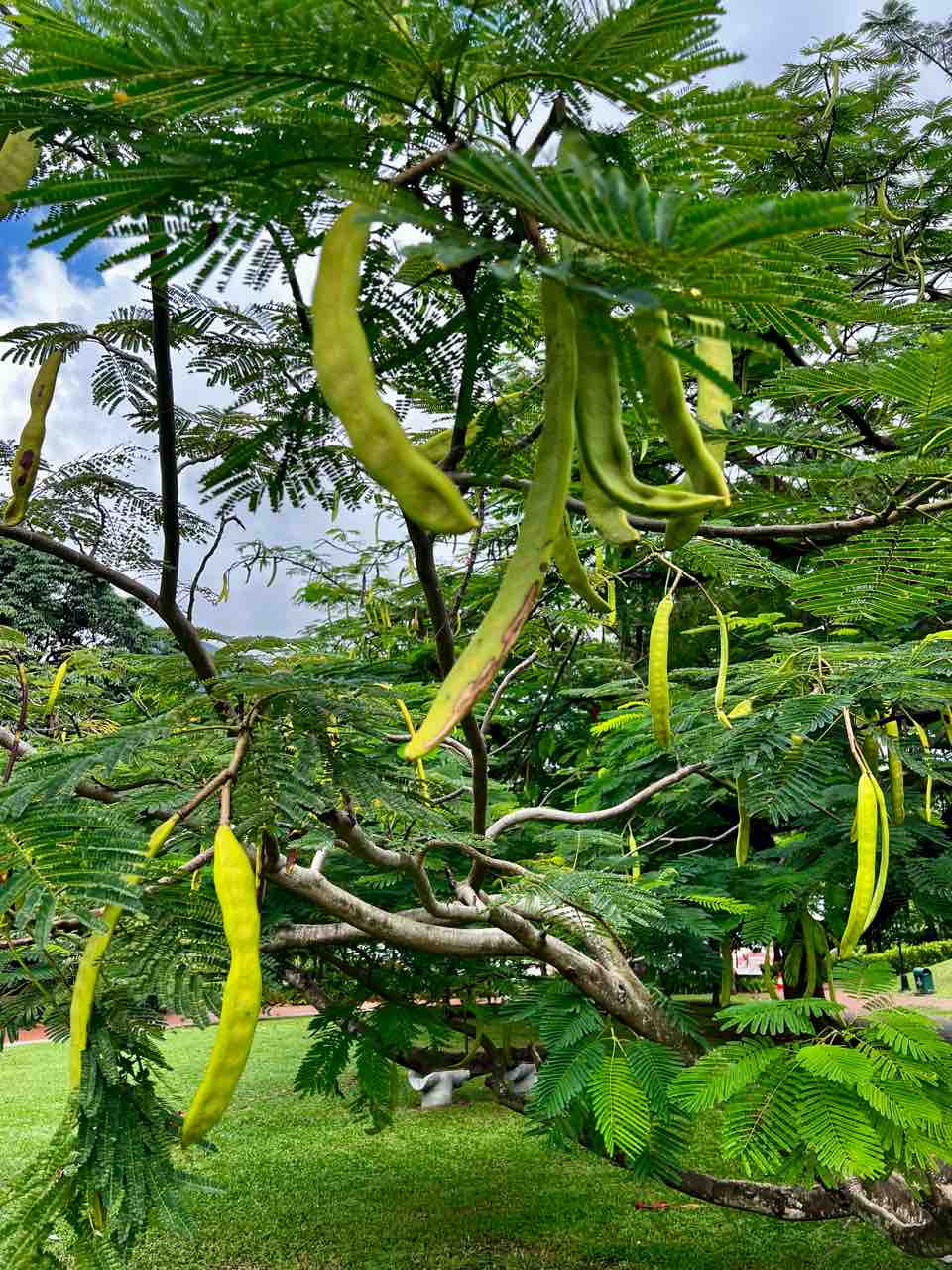 チャッピーに聞いたら、熱帯地方でよくみる「レインツリー(Rain Tree)」というらしい。マメ科の植物だけど、人間は食べるものではなさそう。