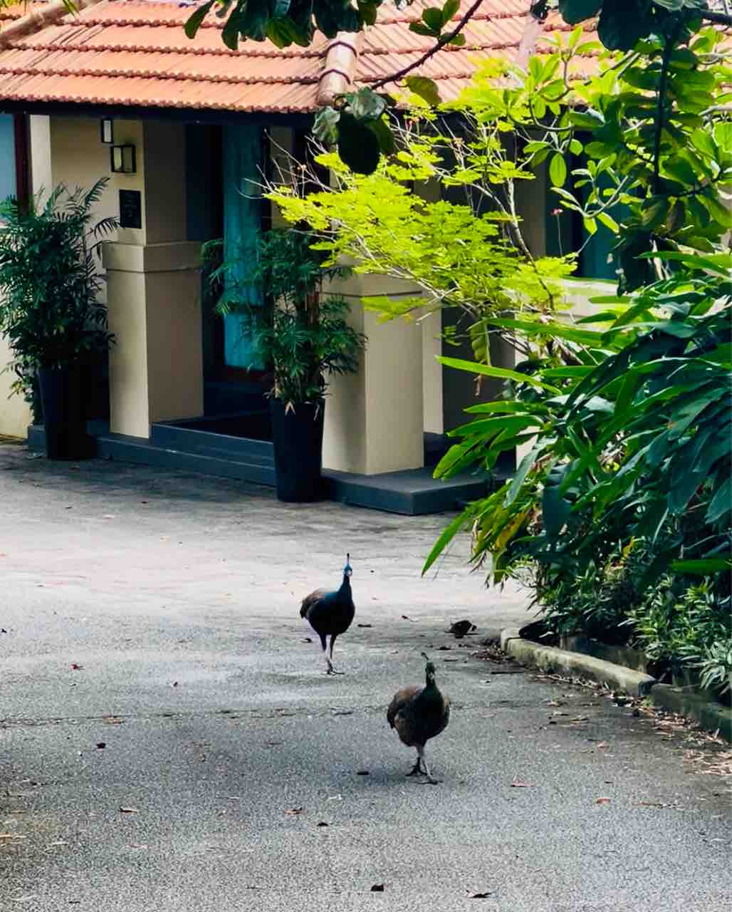 広大なホテルの敷地内を散歩していたら、フツーにクジャクも散歩していた。セントーサ島は島の面積の7割が熱帯雨林で、様々な野生動物が暮らしているらしいが、こんな至近距離でクジャクを見たのは初めてかもしれない。