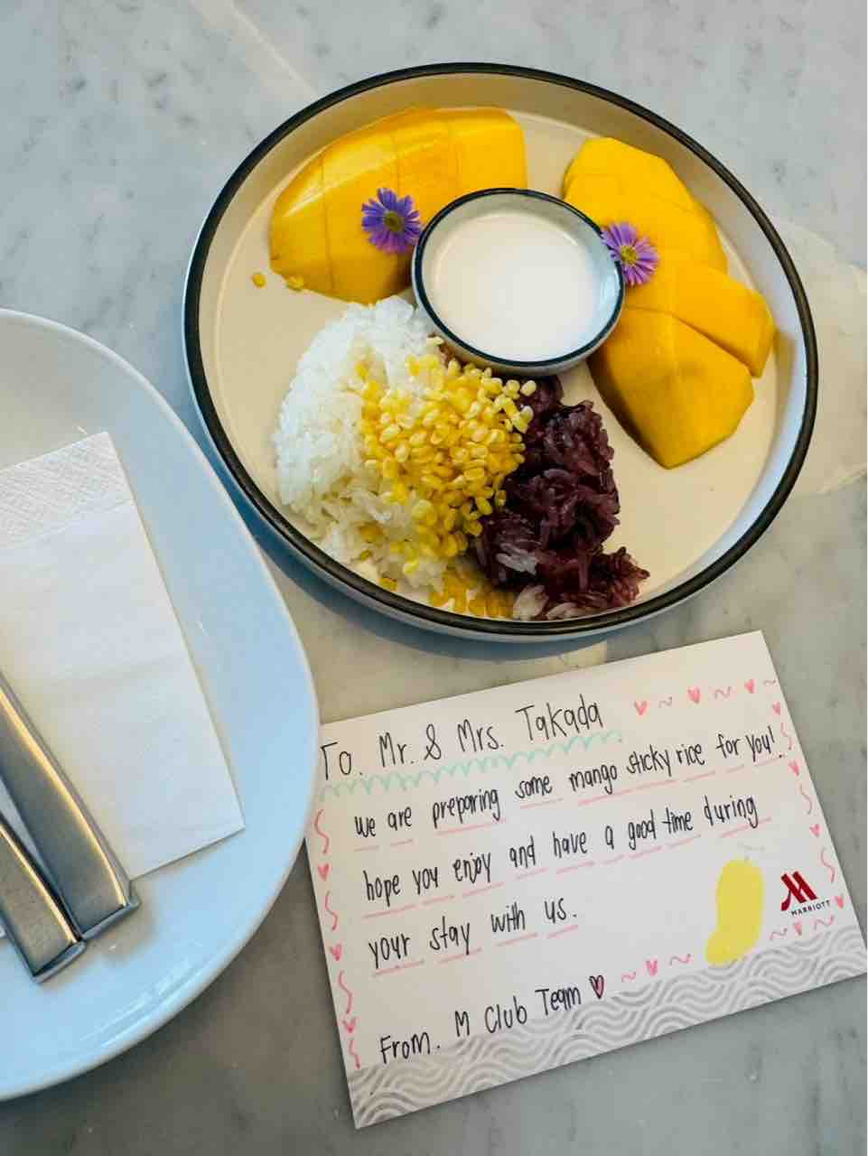 マンゴーは諦めて部屋に戻ったら、部屋のドアがノックされた。扉を開けたら、ホテルのスタッフがトレイを持って立っていた。なんと、マンゴーのスティッキーライスを作ってくれ、持ってきてくれたのだ。しかも、手紙を添えて。