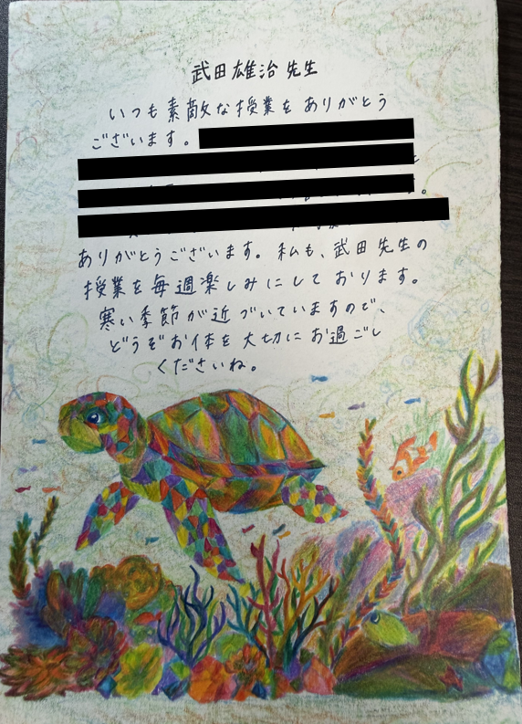 1枚、関学が準備したシートではなく、ウミガメが描かれた便箋で書いてくれたコメントシートがあった。市販の便箋?? と一瞬思ったのだが、よく見ると、手描きじゃないか! 裏面にもコメントがぎっしり書かれていた。泣くわ。大学からは大した報酬をもらえてないが、学生や卒業生に愛されていることが最大の報酬だわ。あと4回、必死で学生と向き合おう。今を生きよう。